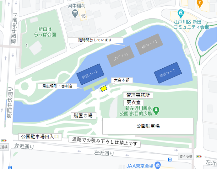 ・大会本部は黄色網掛けになります。当日は大会会場へ直接お越しください。管理棟での手続きは不要です。